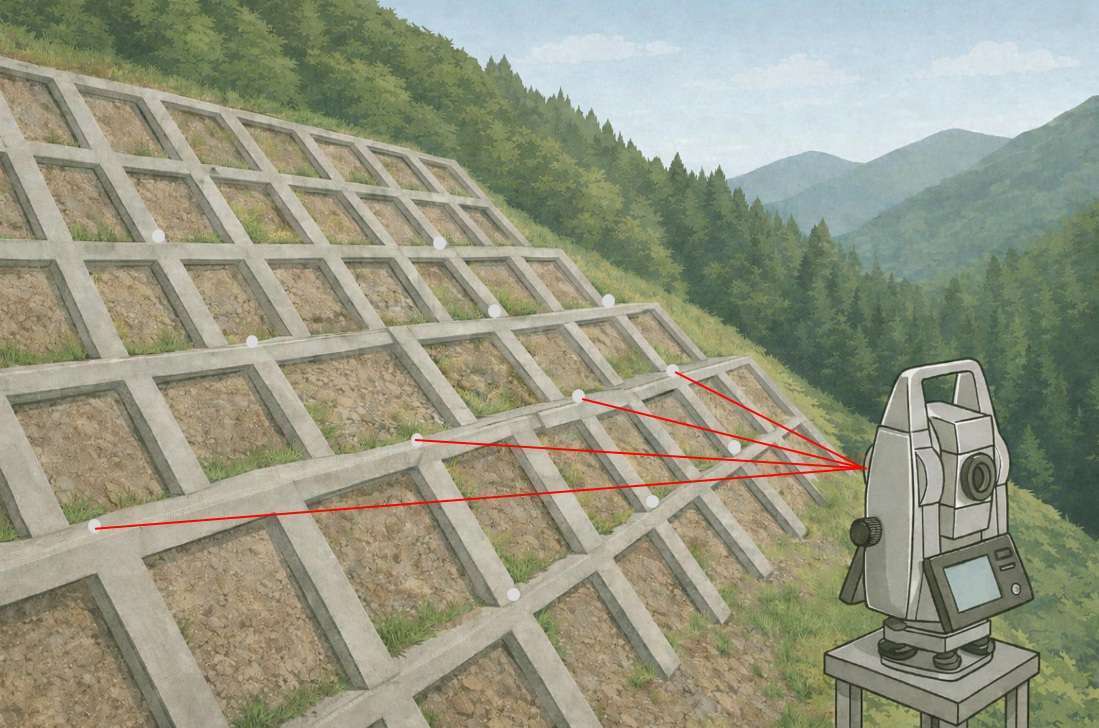 高性能自動視準トータルステーション及び反射プリズムを使用した三次元自動変位計測システムです。